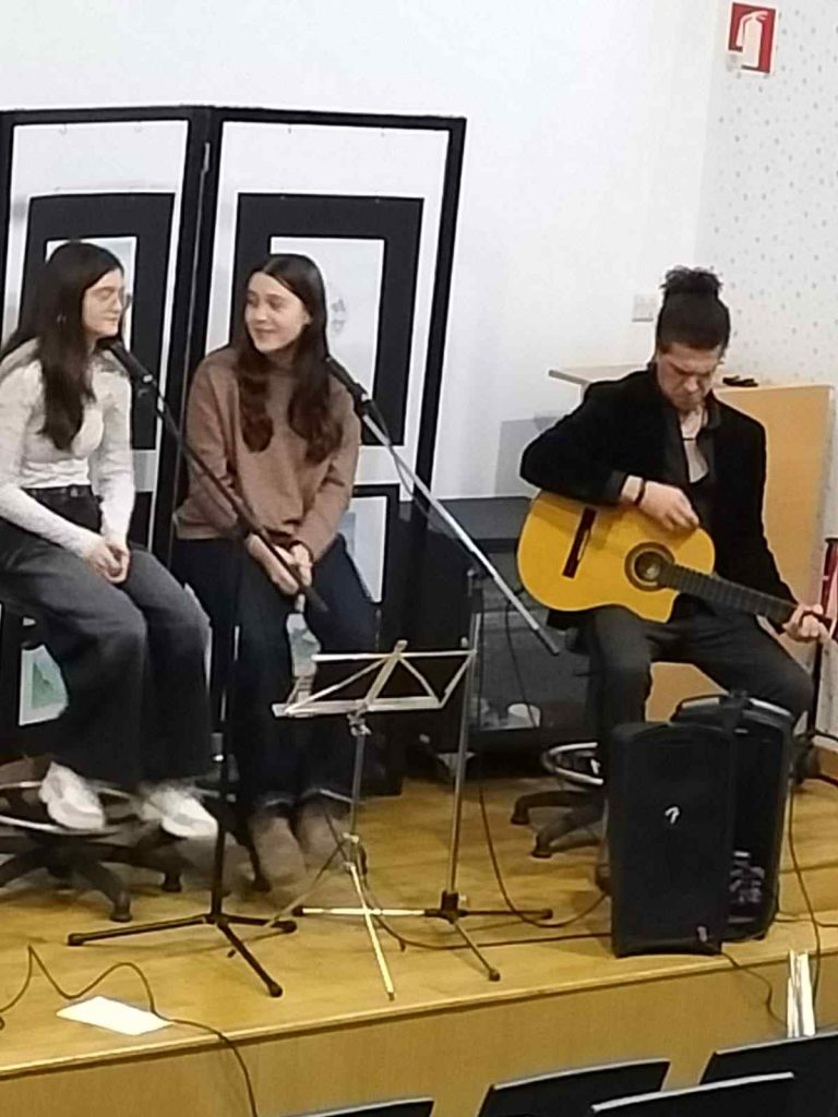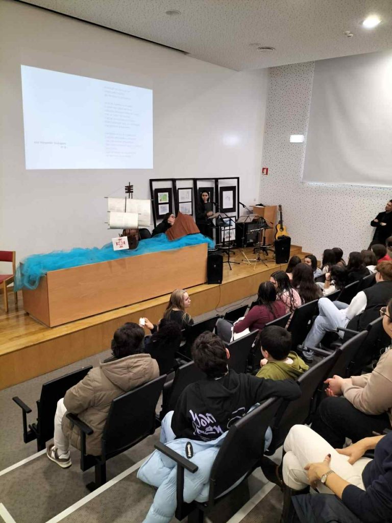 No passado dia 11 de fevereiro, no Auditório da Escola Sede, foram apresentadas algumas dessas atividades, num pequeno espetáculo que integrou momentos de música, leitura de poemas, uma biografia em verso e até uma entrevista a Luís Vaz de Camões. Assistiram a este momento cultural as turmas do 8.º e 9.º anos e ainda a turma do 7.º A.