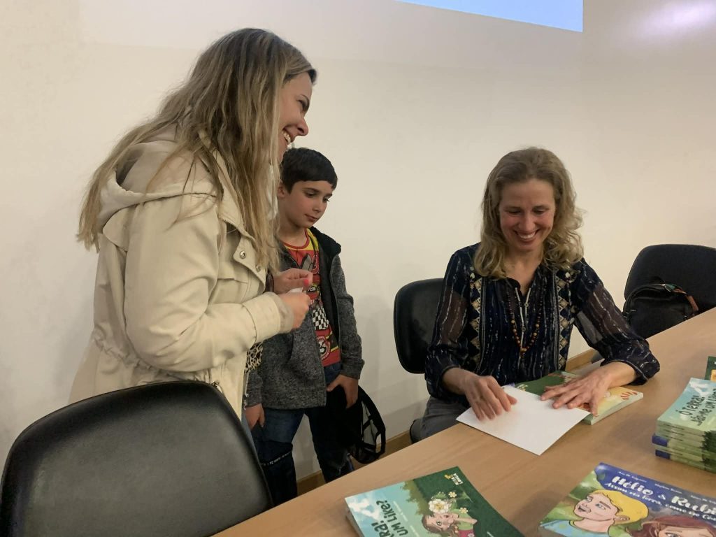 A autora dinamizou duas sessões animadas, cheias de conversa e boa disposição, nas quais se falou do senhor Neurónio, das tecnologias, da empatia e do equilíbrio que devemos procurar na vida.